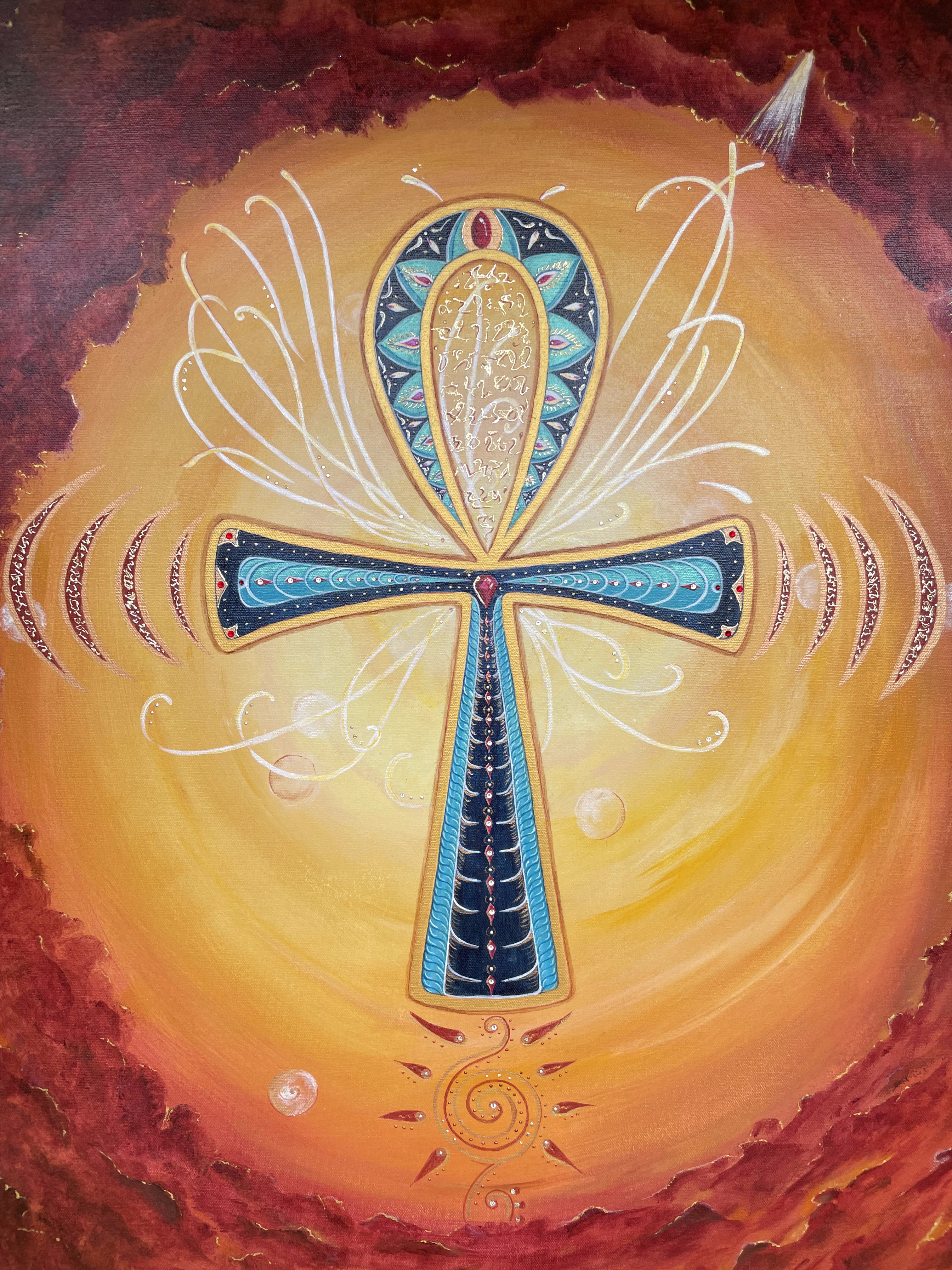 Un matin, lors d’une méditation profonde, ce symbole m’est apparu avec une force inattendue. Une impulsion puissante m’a poussée à peindre la Clé de Vie, sans que je comprenne encore pleinement sa signification.