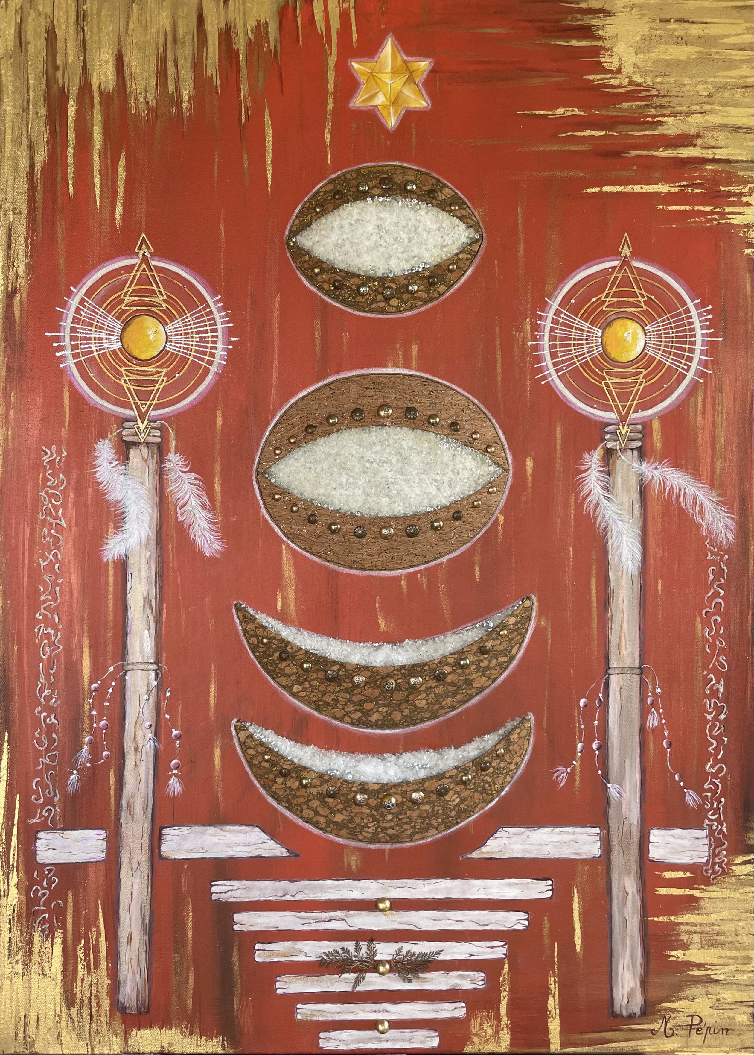 Les deux bâtons symbolisent cette force accrue, consolidée par la conscience et le pouvoir intérieur. Les plumes, quant à elles, représentent la présence bienveillante des guides et des anges, qui accompagnent l’être sur son chemin de transformation.